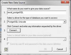 For option 1, put any name that you like for this datasource connecetion, in this case it is called ‘excel_postgreSQL’. Option 2, choose ‘PostgreSQL Unicode’. Then for Option 3, click on the connect button and another popup will open.