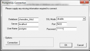 For this popup window, it will ask for your postgreSQL connection. Fill in the form based on your setup. Click OK after finish filling all field.