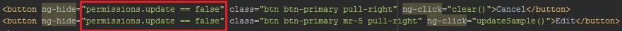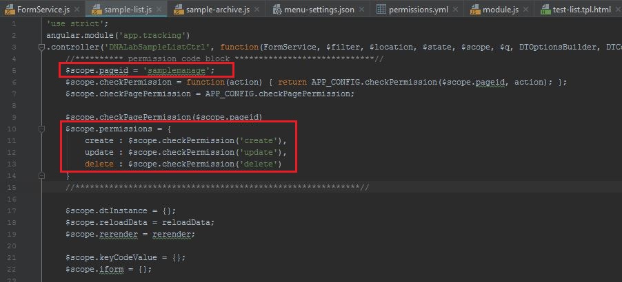 – $scope.pageid is represent the page name to use in permission file- $scope.permissions is represent what action can be taken from the page, default will be create, read (default), update, delete, which equal to #crud in permission.yml.