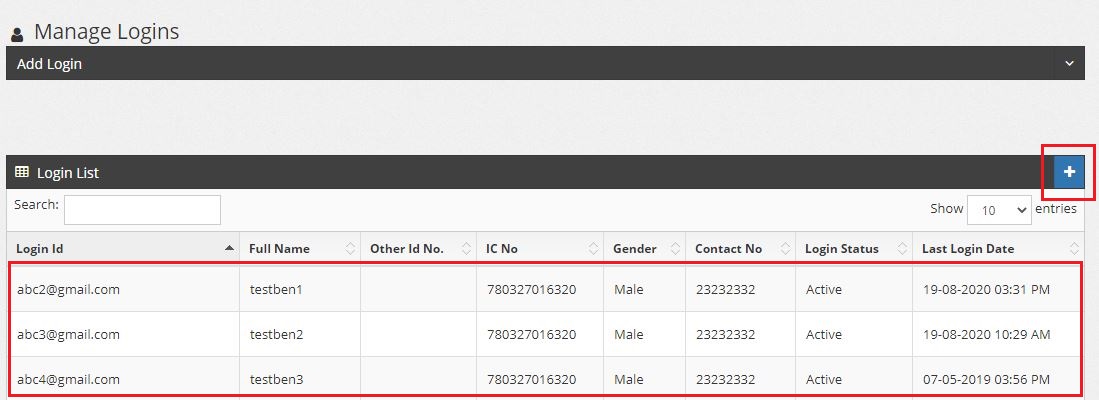 In Manage Logins page, to add a new login user can click the blue + button, for edit existing user just simply click the row of user and a slide down form will display on top of the table.