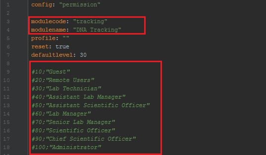 – modulecode is to set which module using this permission, modulecode can refer from gulfile.js when setting xmodule.- modulename is the name of the module.- User role can be trigger based on the list of “green text”, #[number] represent rolelevel from Database table base_approles, but in opposite way, which mean if #20 “Remote Users” in table will be list as rolelevel 90.