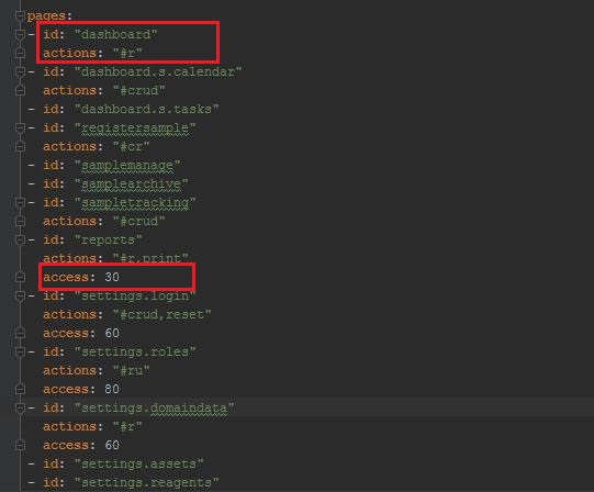 After setup the identification of the permission, next will be configure what page allow to take what action. Before we go for the list, you can retrieve the page id and action from JS file, take sample-list.js as example, refer below image: