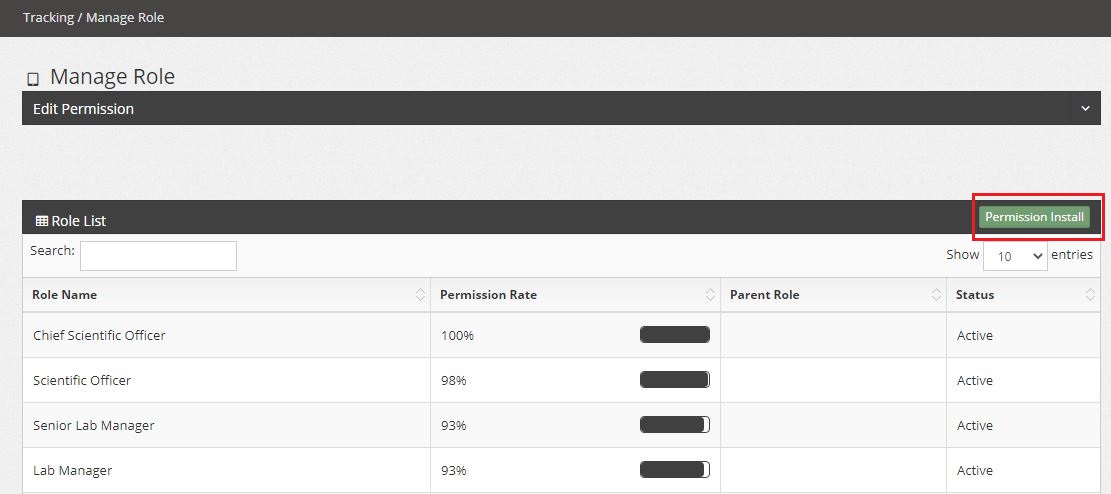 In Manage Role page, look for the green button “Permission Install” and click on it. A pop should appear to let you insert the permission content copy from permission.yml file.