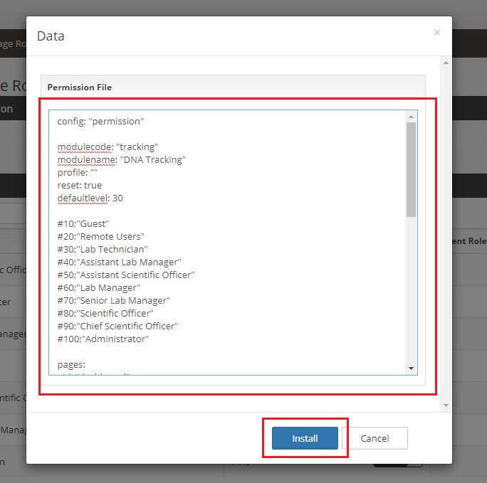 After a pop up appear, just insert the permission content into the text box / text field, and click “Install” to save the permission into database. Once install successfully, a “success” message will be show beside the Install button. Refresh the page and the table shall display properly if the permission set correctly.